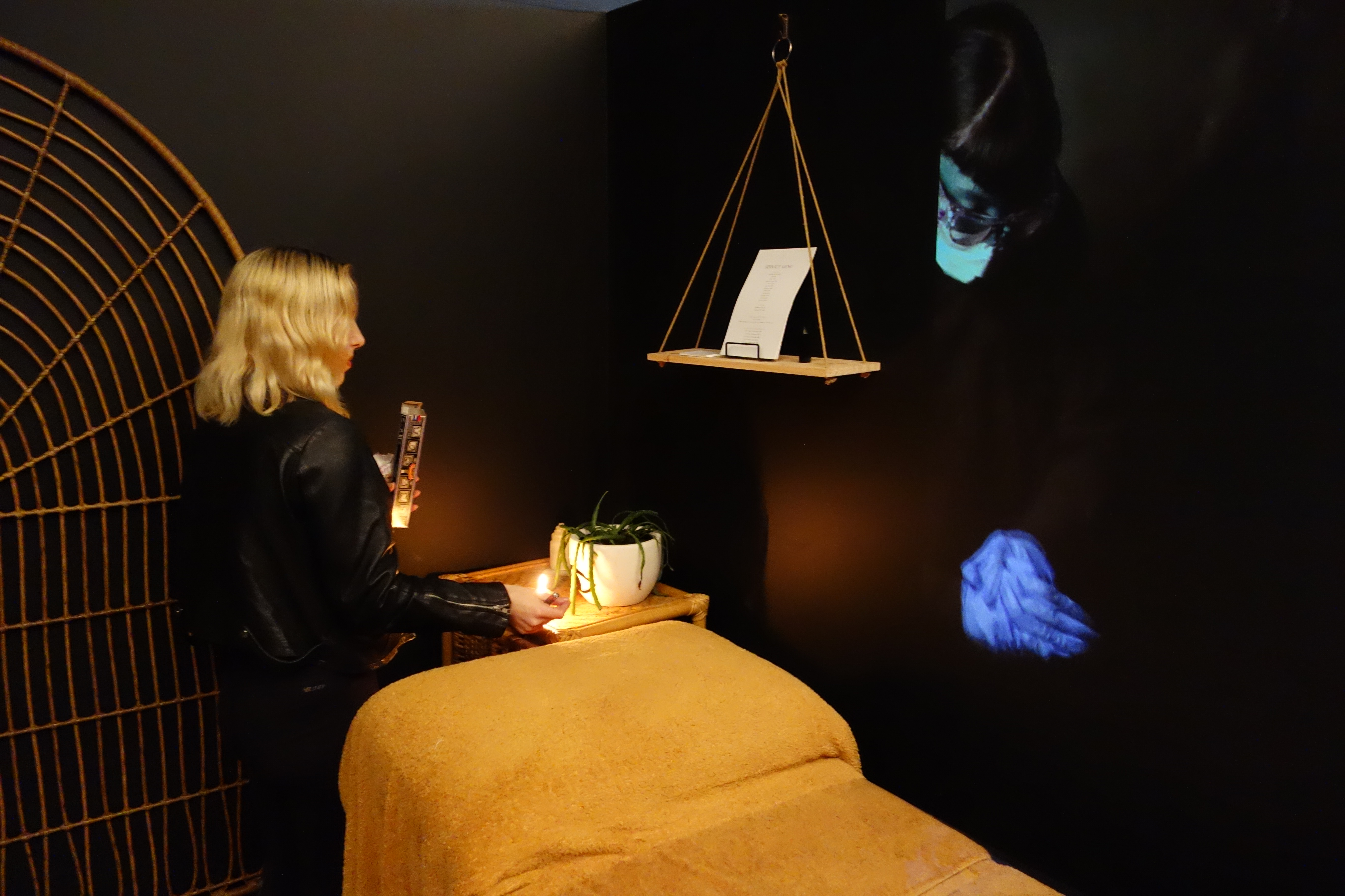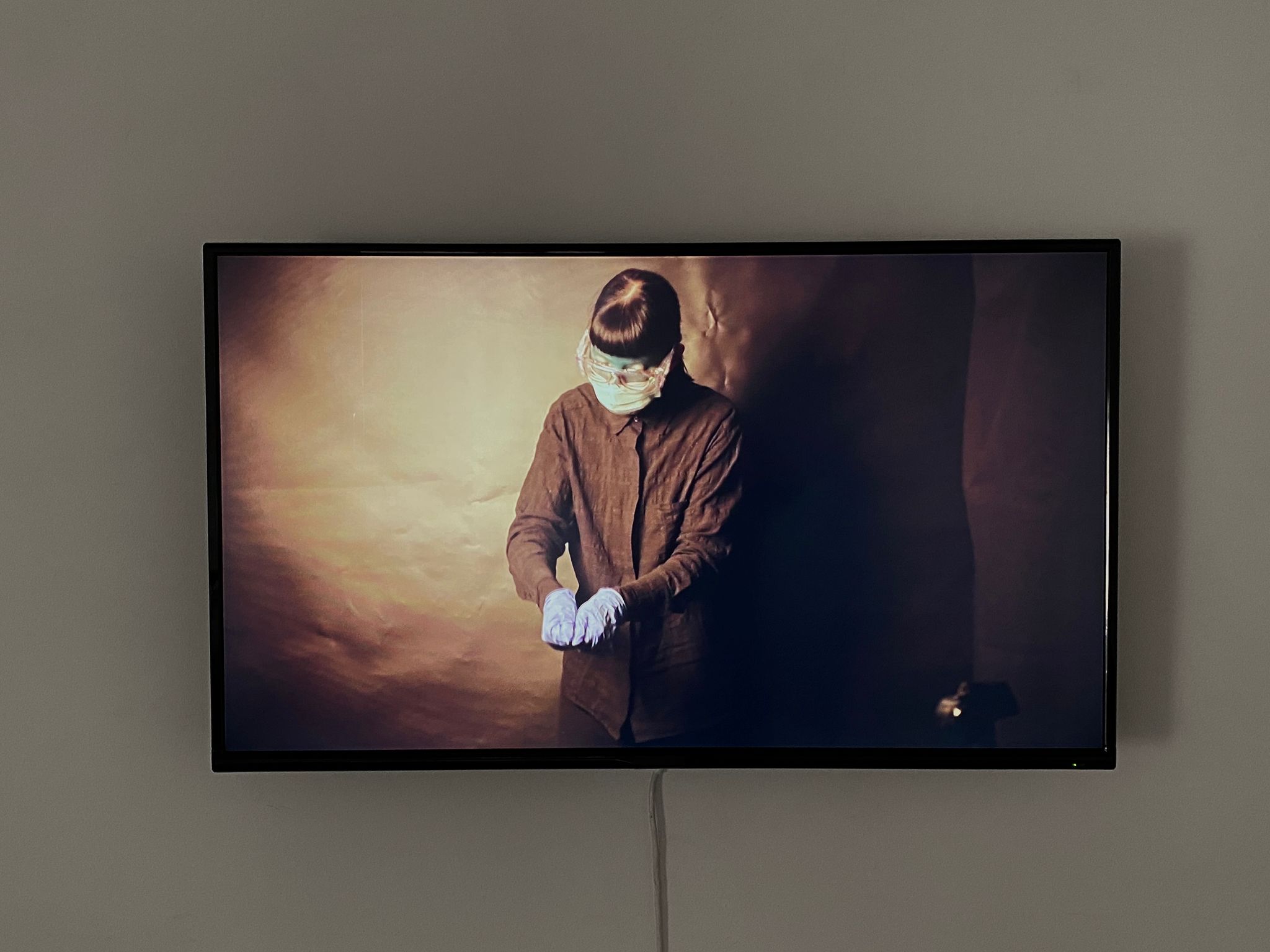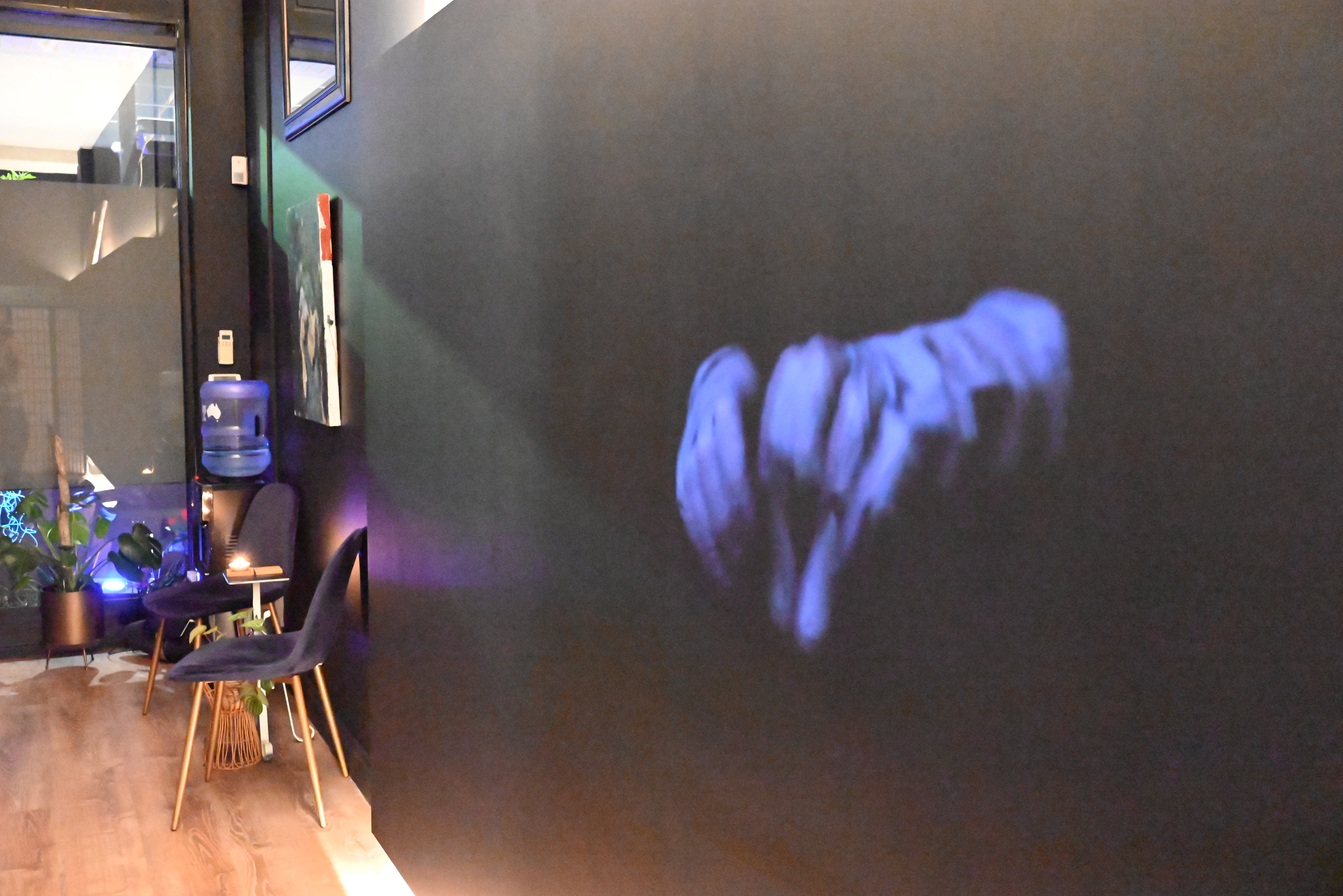 Hands-on, after the distance (2021) was first shown as a site specific performance video installation at Omega Holistic, Little Malop St. Geelong, as part of the NightLight art activation on June 11 2021. The work was shown directly after the fourth major Victorian lockdown arising from the COVID-19 pandemic that began in 2020; it was next installed and exhibited at the Victorian College of the Arts, Artspace Gallery, Melbourne in July 2021. The exhibition was cut prematurely short due to the fifth major lockdown in the state, which was an ironic and tacit convergence with the work’s artistic commentary on persisting with ideals of practice amidst rapidly reforming conditions.