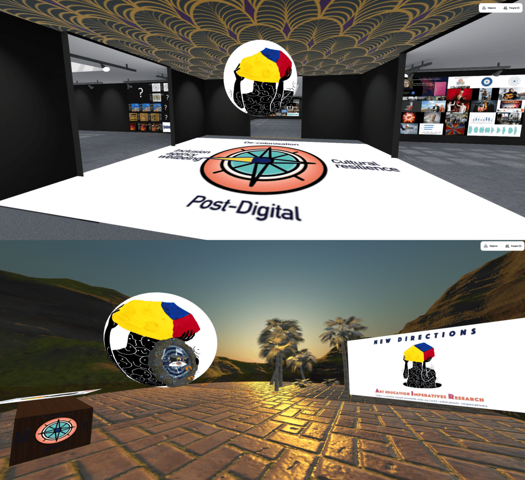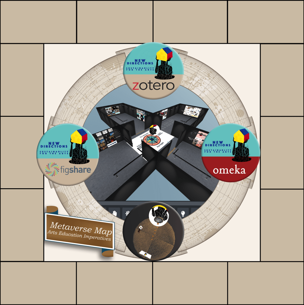 The Metaverse Map is an interactive visual cartography of the key exhibition and repository platforms that constitute the research metaverse for An Arts Education imperative: New directions for sustainability (2021). Using the map as a wayfinding instrument, audiences can direct themselves across the research network and refer back to it for guidance.