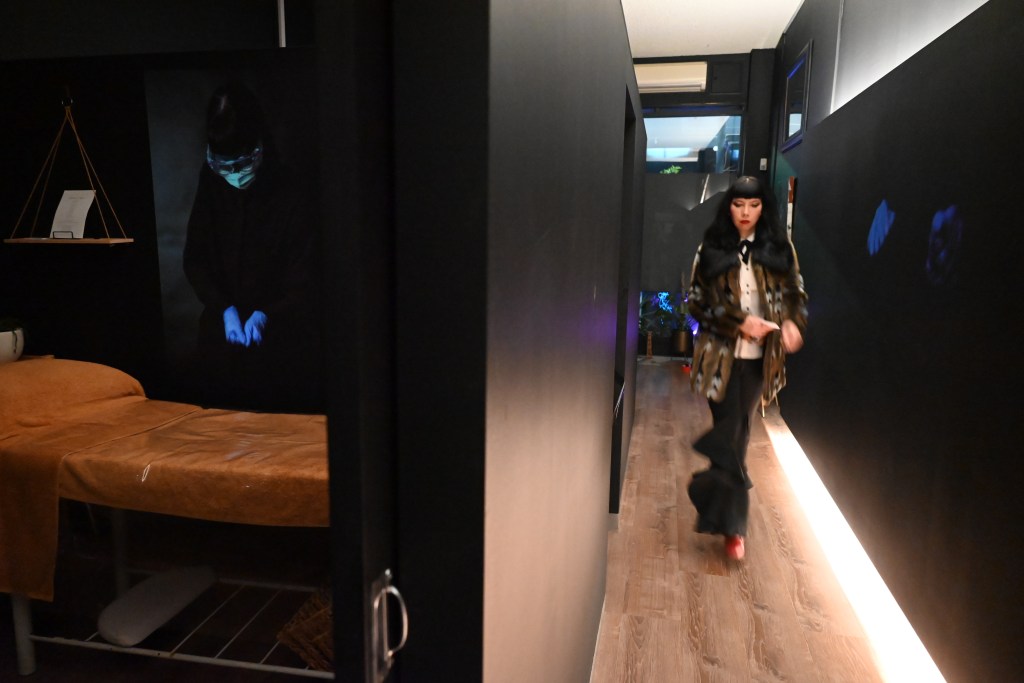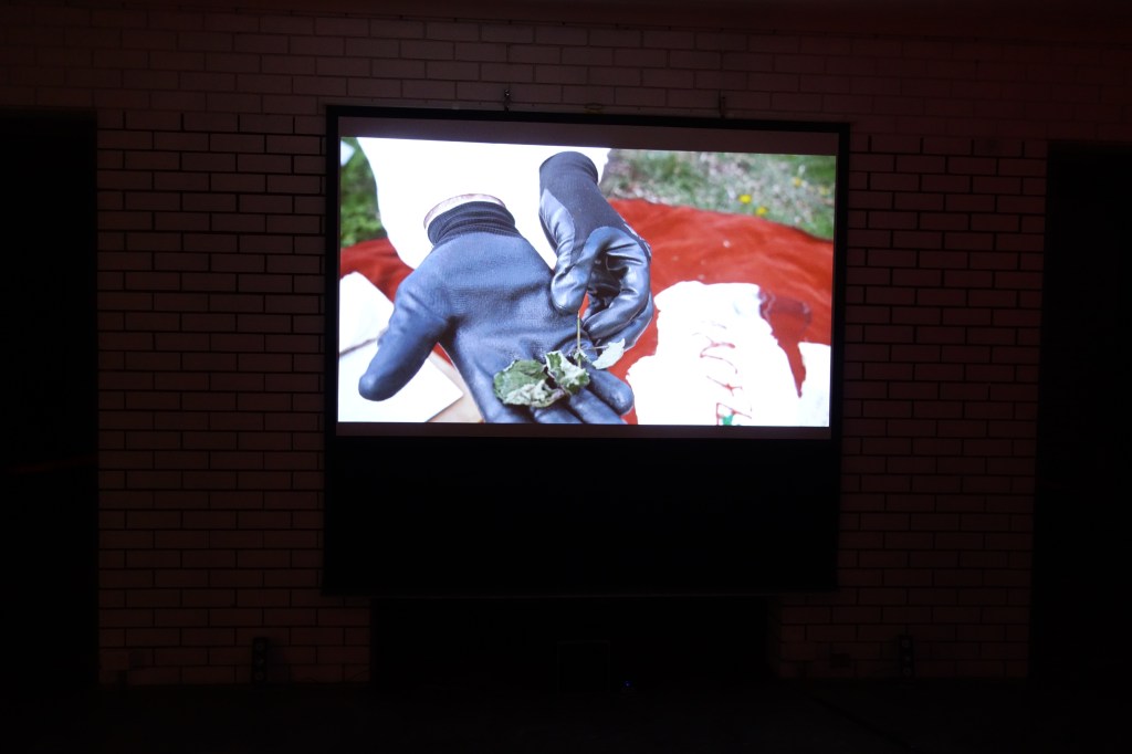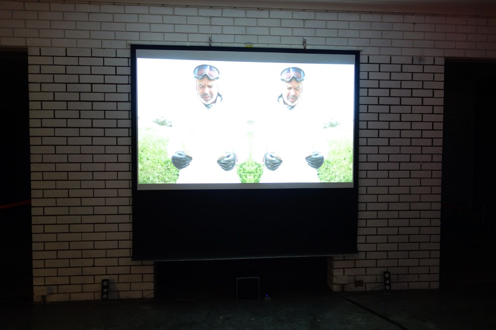 Hands-on, after the distance (2021) is a site specific performance video installation at Omega Holistic, Little Malop St. Geelong. It comprises two video projections of a performance by artist and practicing physiotherapist Jessica Laraine Williams. The performance is constructed to appear as a disembodied massage treatment conducted remotely- an inherently absurd concept that dissects the notion of ‘hands-on’ practice in a socially-distanced world. Hands-on, after the distance, responds to the symbolic shifts in identity and practice that demarcate an extraordinary period of Australian pandemic time. A customised PPE visor and sterile blue are among the artist’s characteristic identifiers in her regular clinical work. They are enshrined through focal use of colour in the artworks.