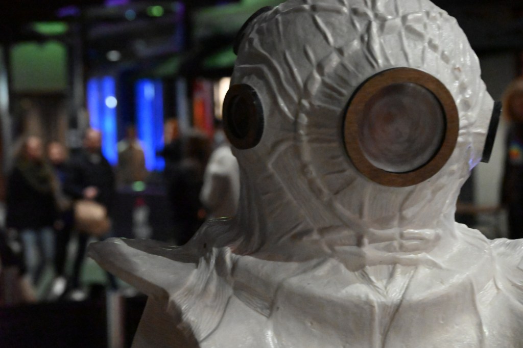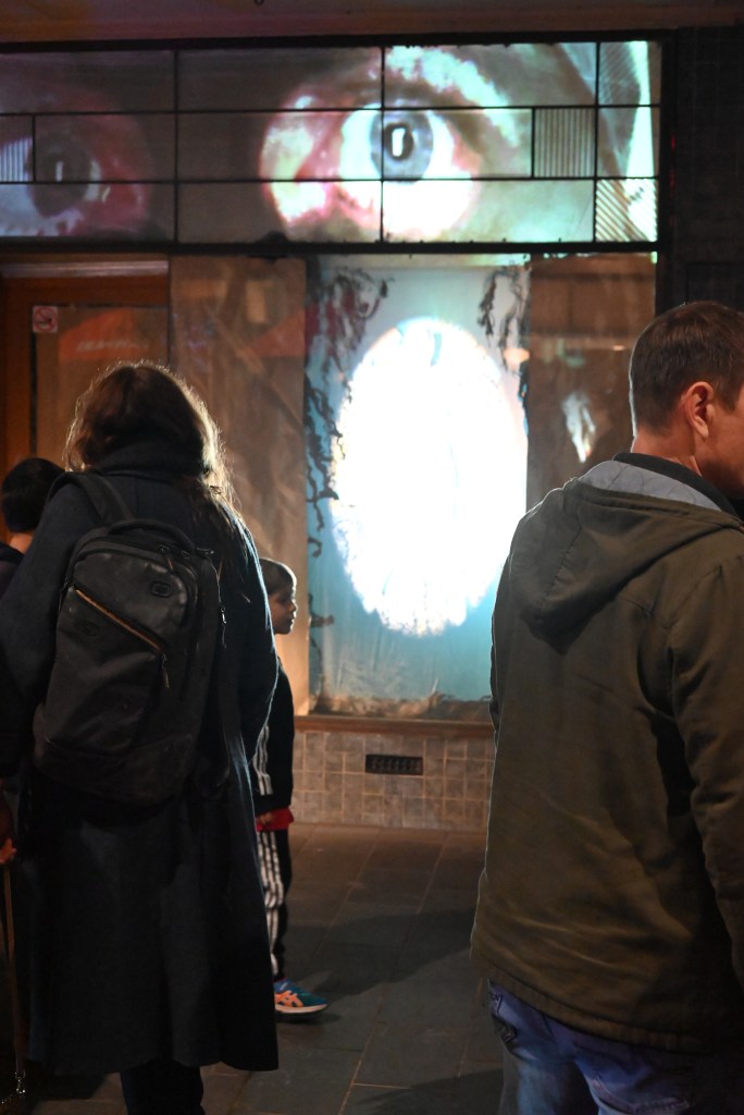 In humanity’s early history, symbiosis with nature was the key element of survival and prosperity. In our deep psyche, we still consider ourselves to be a part of this process, but civilization has put us at extreme odds with the natural world. We need to re-evaluate our position in nature, rediscover lost knowledge, and nurture the natural world that the human body and mind are part of. There is always more beneath the surface: this light installation shows micro-environments contained in a fish tank in the forms of a human head – both constructed and natural, using glass, plastic, water, and air. The background projection reflects energy and growth.